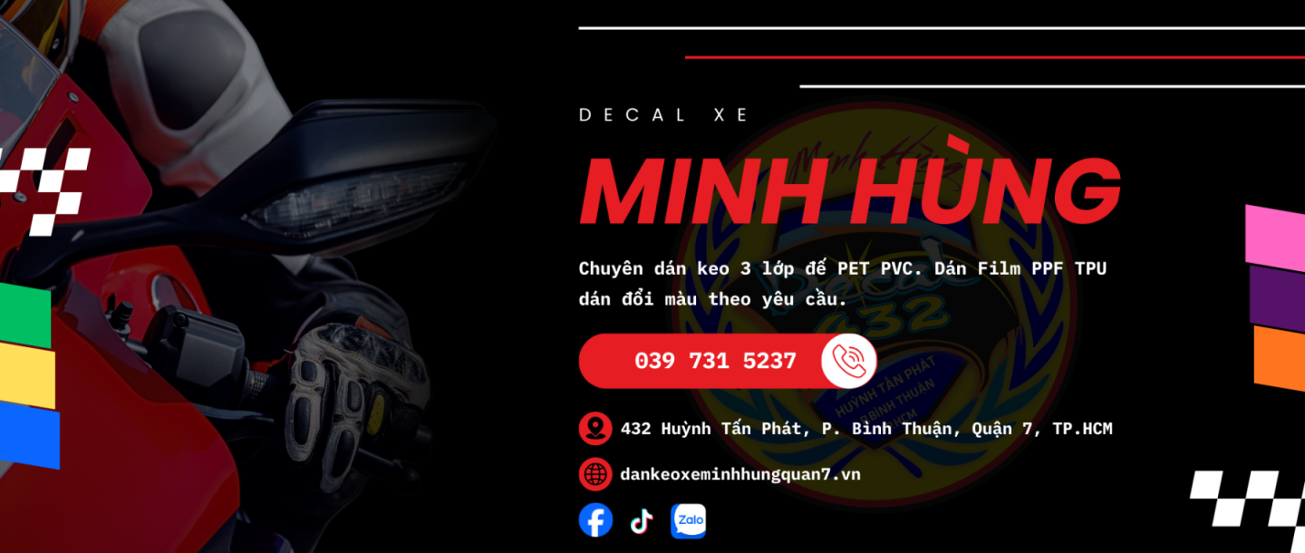Minh Hùng Decal được thành lập từ năm 2020, chuyên cung cấp các dịch vụ bảo vệ và trang trí xe máy – ô tô tại Quận 7, TP. HCM. Với niềm đam mê dành cho xe và sự tỉ mỉ trong từng chi tiết, chúng tôi luôn hướng đến việc mang lại trải nghiệm dịch vụ chuyên nghiệp, uy tín và chất lượng bền vững cho khách hàng.